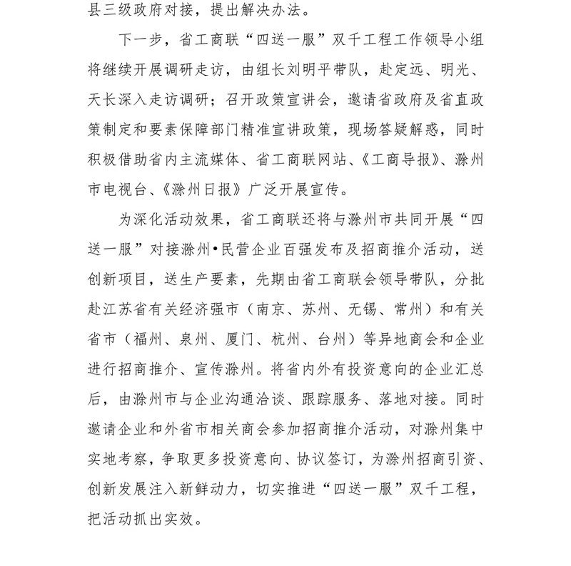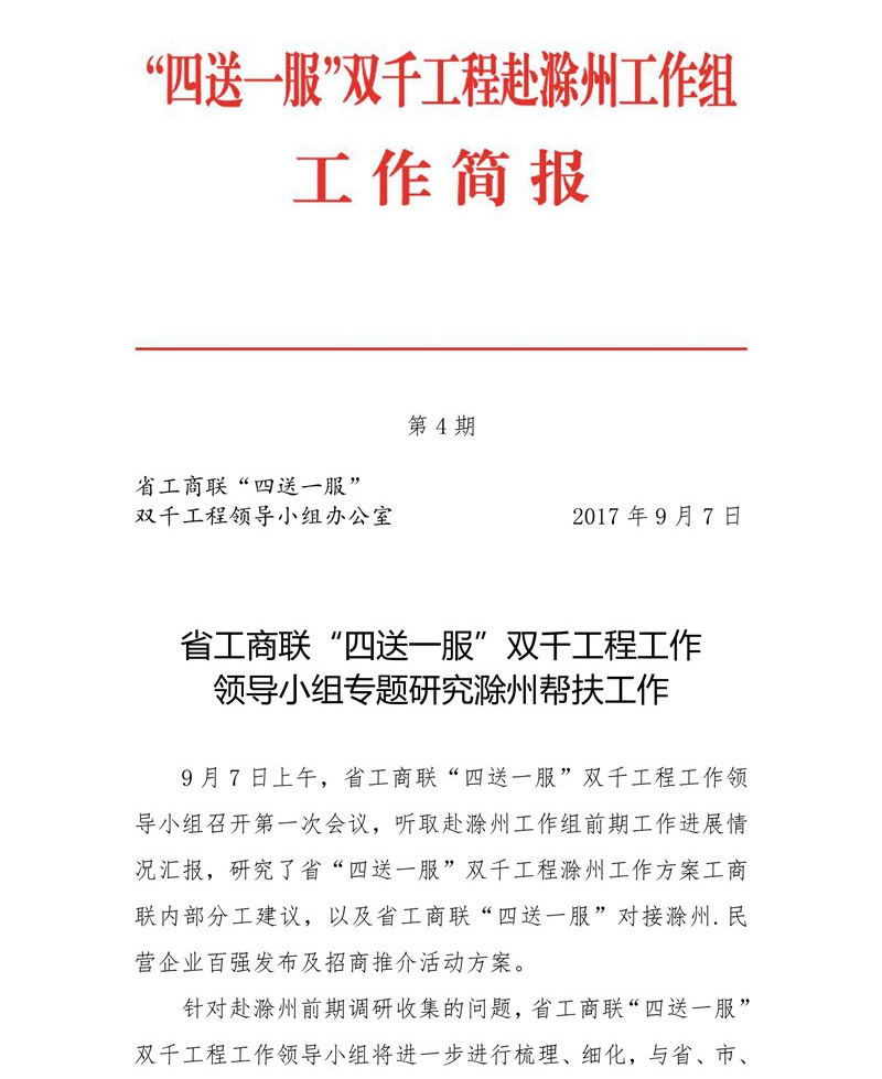 省工商聯(lián)“四送一服”雙千工程工作領(lǐng)導(dǎo)小組專(zhuān)題研究滁州幫扶工作