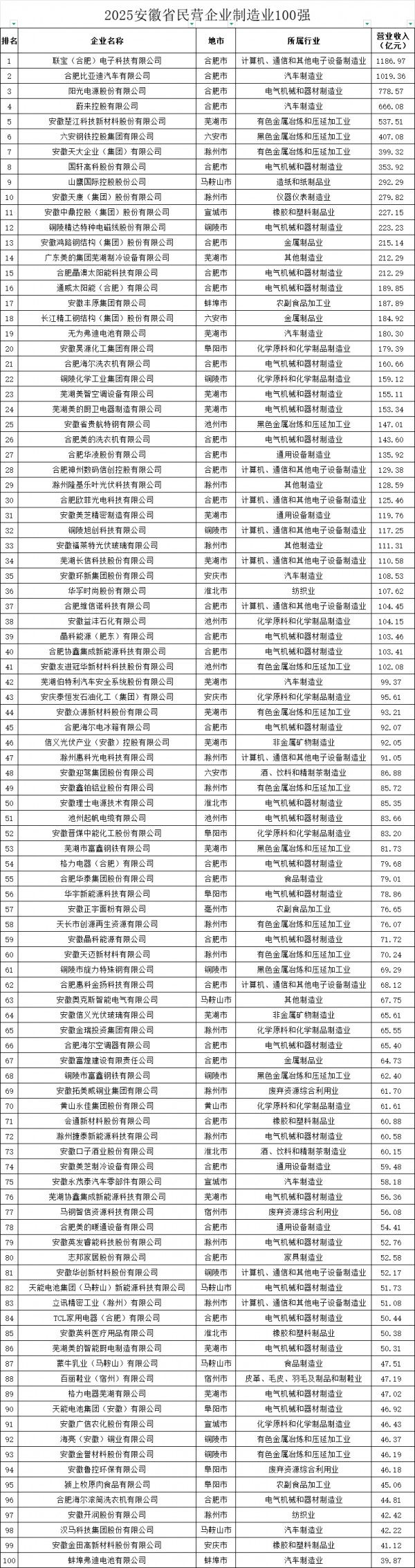 聯(lián)寶(合肥)電子科技有限公司、合肥比亞迪汽車有限公司、陽光電源股份有限公司、蔚來控股有限公司、安徽楚江科技新材料股份有限公司位列安徽民營企業(yè)制造業(yè)百強(qiáng)前五。