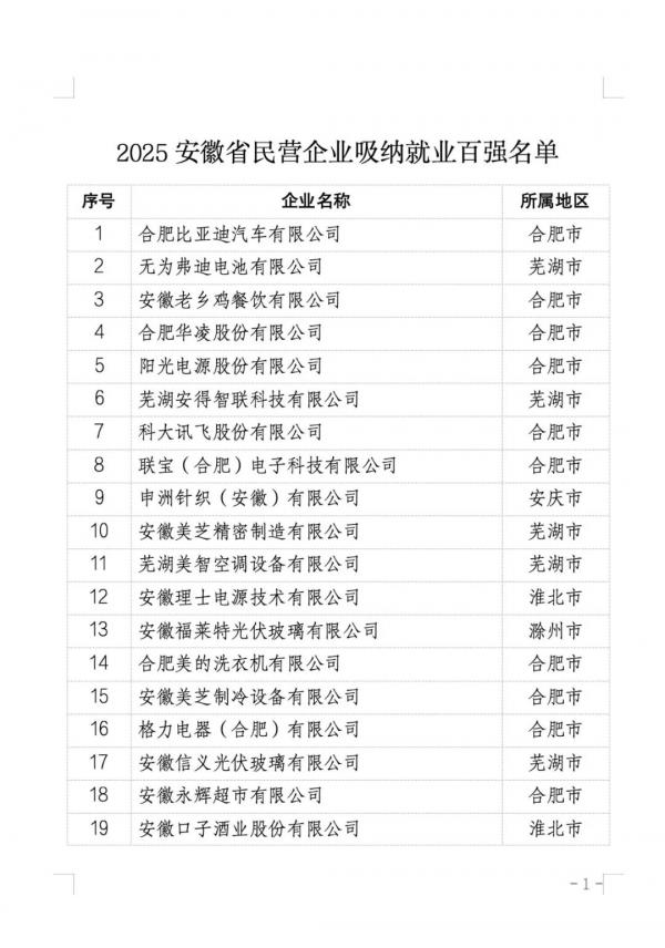 合肥比亞迪汽車有限公司、無為弗迪電池有限公司、安徽老鄉(xiāng)雞餐飲有限公司、合肥華凌股份有限公司、陽光電源股份有限公司位列安徽民營企業(yè)吸納就業(yè)百強(qiáng)前五。